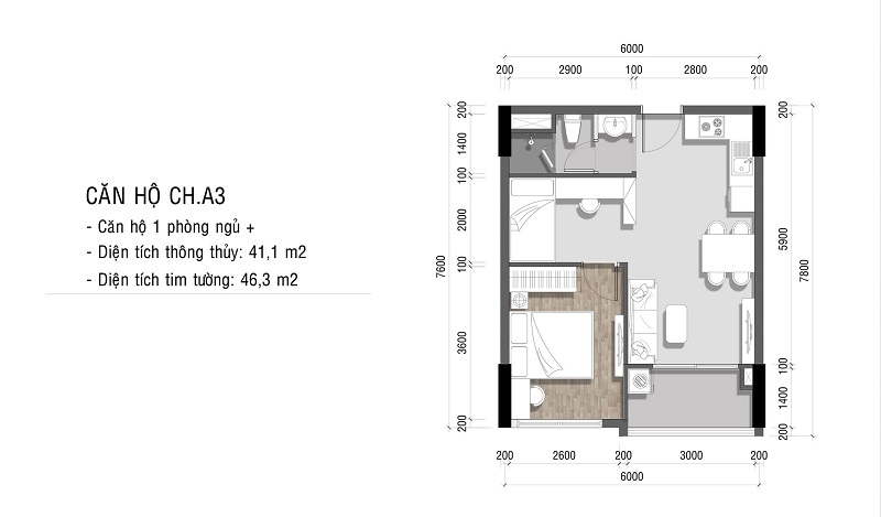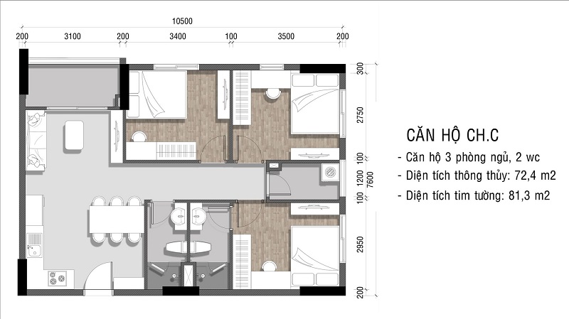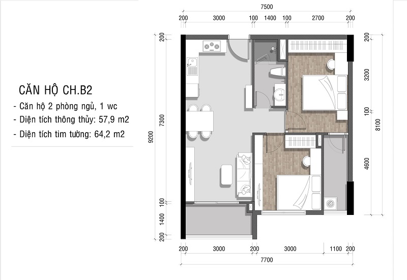 Diện tích căn hộ: từ 35 – 90 m², phù hợp với nhu cầu 1–3 phòng ngủ.